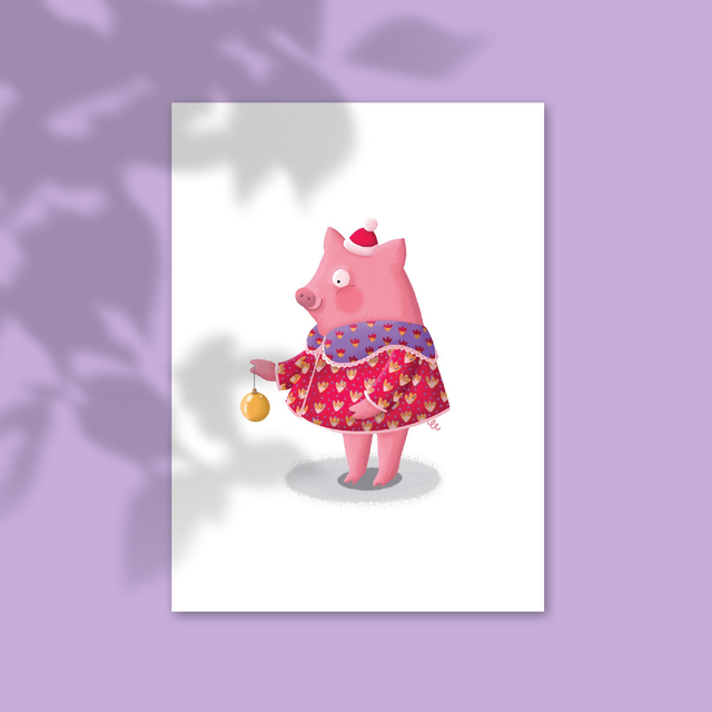 Cette carte de Noël représente une adorable truie élégamment vêtue, coiffée d'un petit bonnet festif et tenant une boule de Noël, prête à répandre douceur et bonne humeur pour les fêtes.